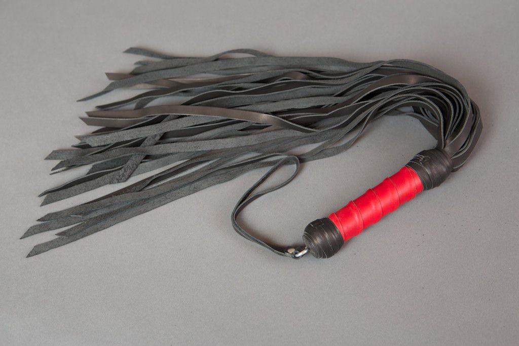 Плеть-флоггер с витой ручкой выполнена из натуральной хромовой кожи черного и красного цветов. Максимально удобная рукоять этой многохвостки прекрасно ложится как в женскую, так и в мужскую руку. Мягкость 30 полос этого флоггера, обеспечивает безопасность даже при значительной силе удара. Ручка флогера обмотана полосой кожи красного цвета, с декоративными элементами. Длина хвостов - 30 см.