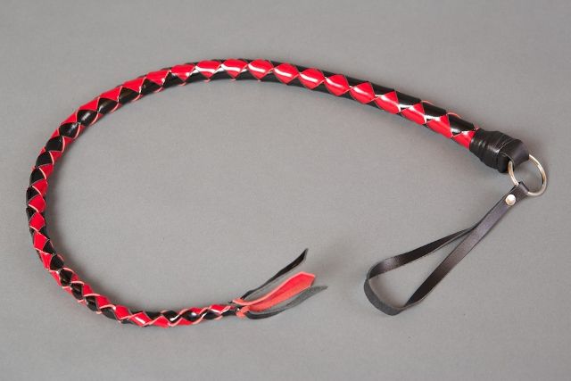 Плеть однохвостая. Материал: черно-красная лакированная кожа. Применяется для точечного воздействия, протяжек, ударов накатом и других комбинаций ударов. Имеет сильное и жесткое воздействие. Используется после предварительного разогрева тела.