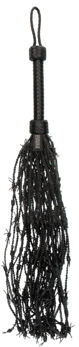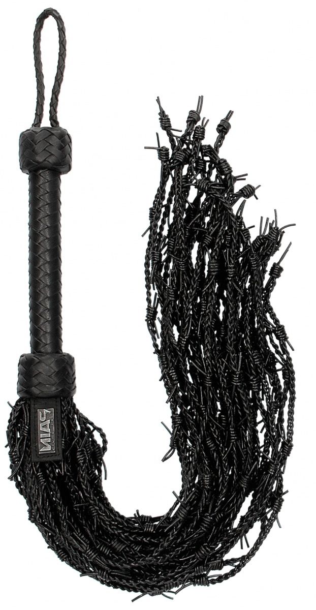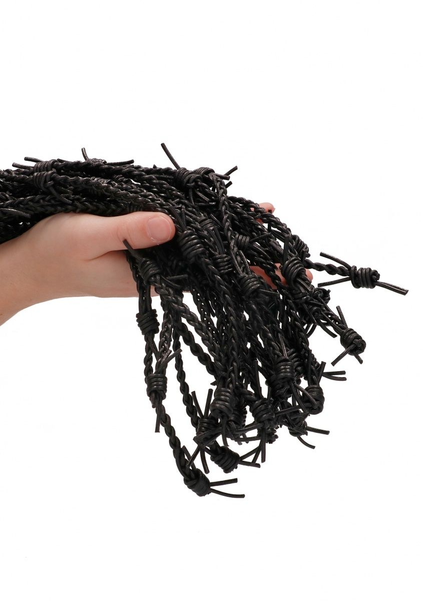 Многохвостая плетеная плеть Leather Barbed Wire Flogger. Эта красиво сделанная плеть с колючей проволокой из настоящей кожи LEATHER BARBED-WIRE FLOGGER вселит своим пугающим дизайном в вашего саба страх. Встроенные кожаные колючки будут царапать и щекотать при легком применении, но при более тяжелой руке они являются силой, с которой надо считаться. Эта плеть из высококачественной настоящей кожи состоит из 36 тонко сплетенных хвостов с узлами из колючей проволоки. Эта плеть с изысканной непроскальзывающей ручкой и петлей на запястье для обеспечения оптимального контроля - прекрасное дополнение к любой БДСМ-коллекции! Длина рукояти - 24 см.