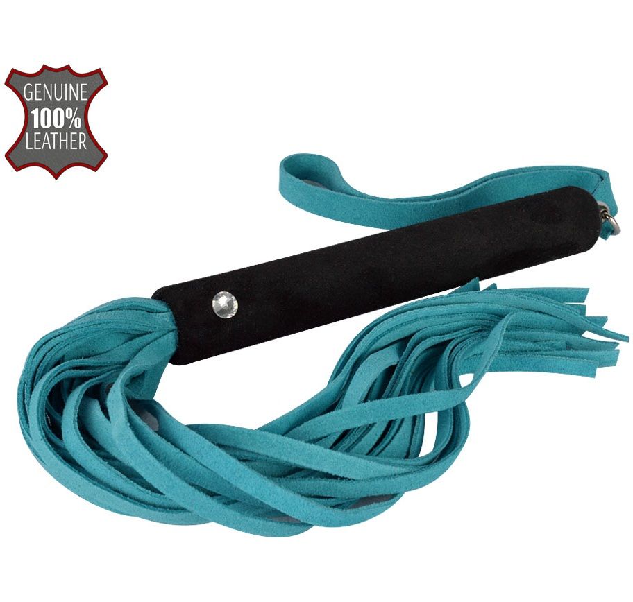 Мягкая плеть изготовлена из натуральной велюровой кожи. Рукоять также обтянута велюровой кожей и украшена небольшим стразом.