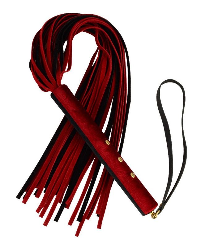 Плеть изготовленна из натуральной велюровой кожи красного и черного цвета. Рукоять обтянута велюровой тканью в черно-красной гамме и украшена клепками. Для удобного использования на торце ручки имеется ремешок. Длина ручки – 17 см.