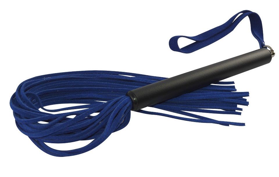 Небольшая плеть с хвостом из тонких лент натуральной велюровой кожи. Ударная часть плети имеет роскошный глубокий синий цвет. Металлическая рукоять цилиндрической формы. Длина рукояти - 15 см.
