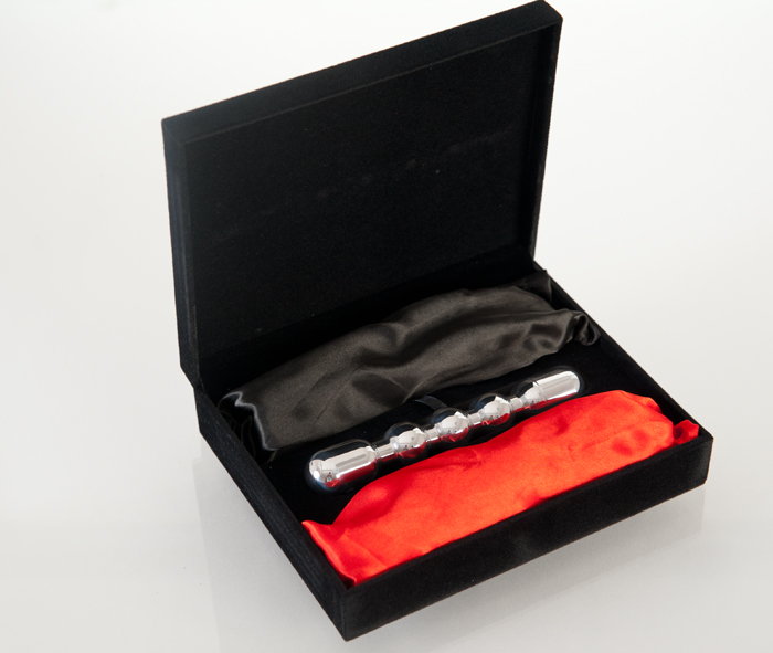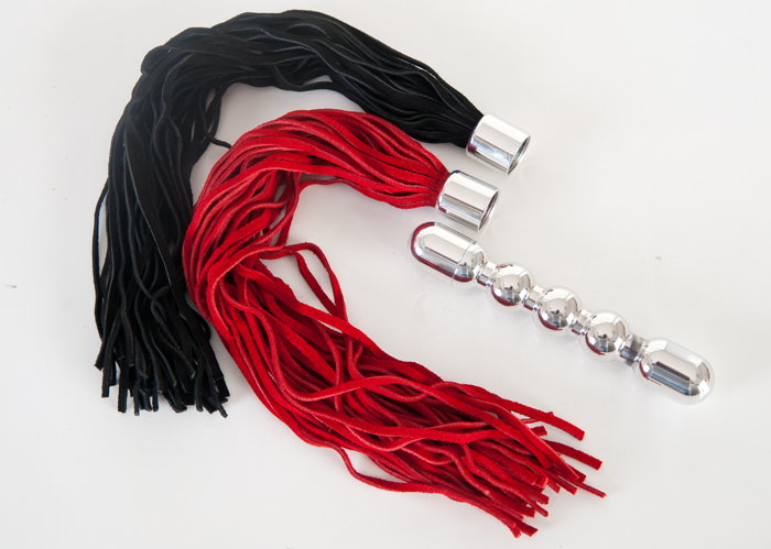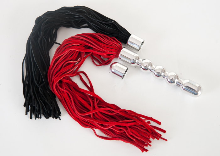 Металлическая анальная цепочка с двумя сменными плетками - красной и чёрной. Длина каждой плети - 35 см.