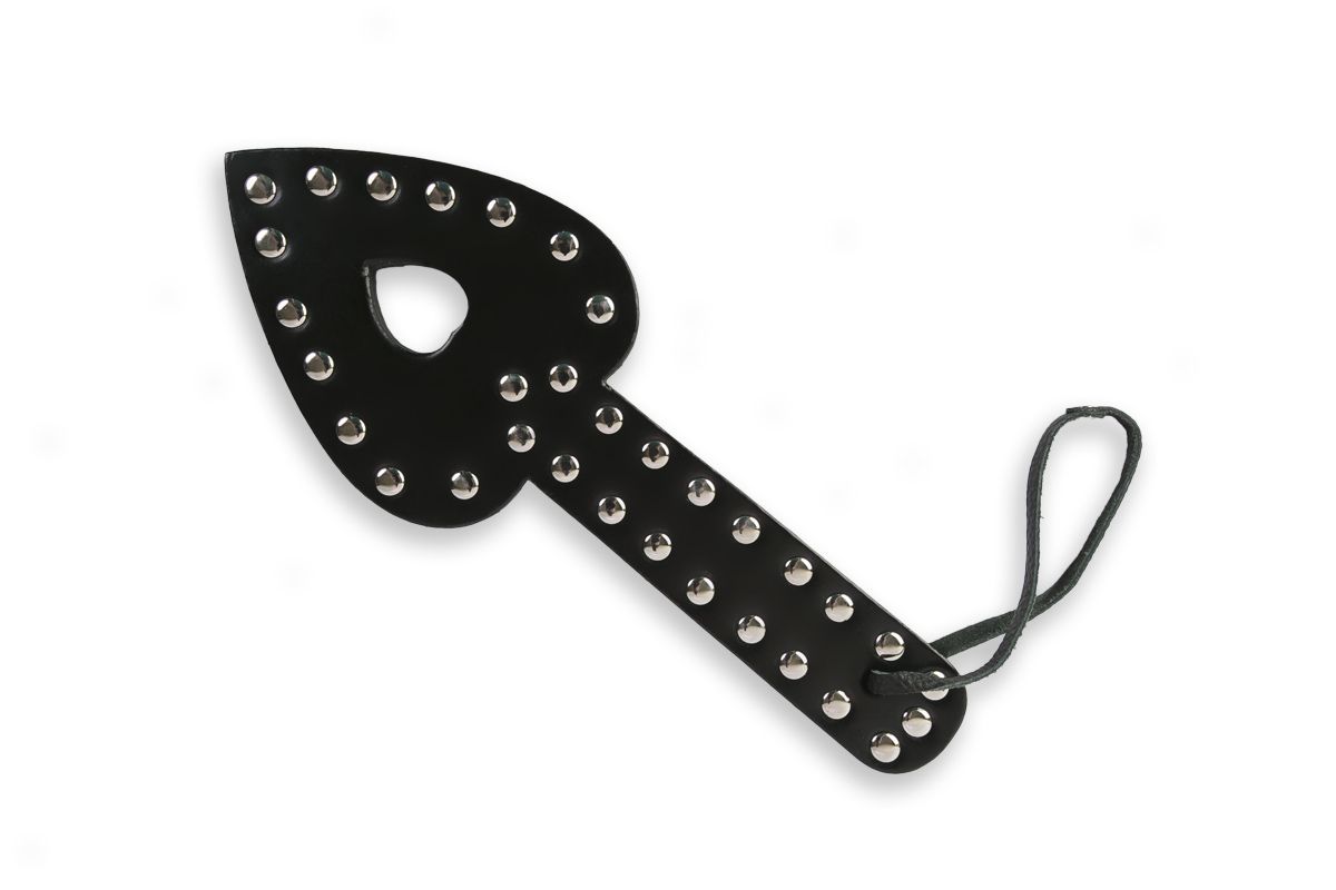 Вам нравятся карточные игры? Пиковая масть придаст эротической игре брутальный характер. Возьмите в руки эту шлёпалку и примените по назначению – мягкое место вашего Сабмиссива уже ждет её воздействия! Кожаная шлёпалка выполнена в форме небольшой пластины с каплевидной верхушкой для шлепков. По краям изделие украшено хромированными заклепками. Для удобства шлёпалка снабжена петлёй. Ширина - 11 см.