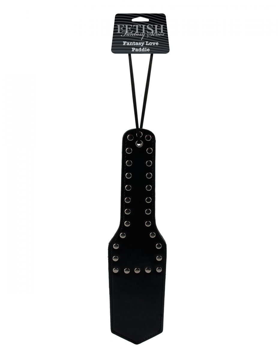 Педдл черного цвета, изготовлен из кожзама, украшен заклепками. Имеет удобную петлю на ручке для комфортного использования.
