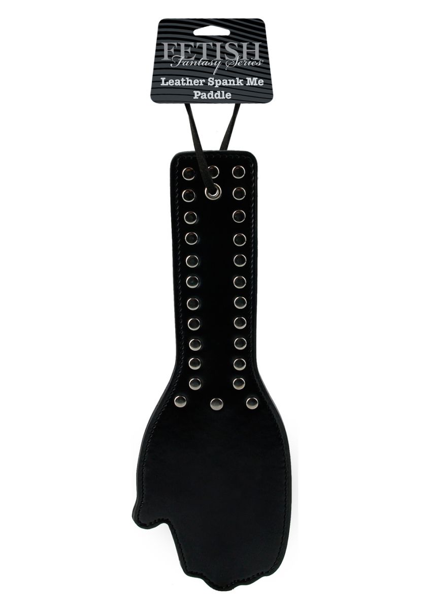 Шлепалка черного цвета из кожзама, декорированная заклепками. Имеет удобную петлю на ручке для комфортного использования.