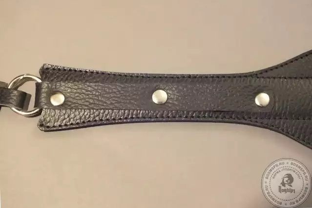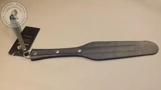 Спанкер выполнен из черной матовой кожи в форме лопатки . Пружинящая вставка из полимерного материала придает спанкеру гибкость. Используется для работы по ягодицам и по верхним мышцам внутренней стороны бедра. Рукоять украшена вставкой из красной кожи и фурнитурой. Проста в применении и безопасна. Во избежании травм не рекомендуется наносить удары ребром. Ручная работа.