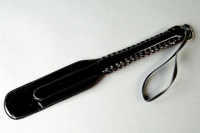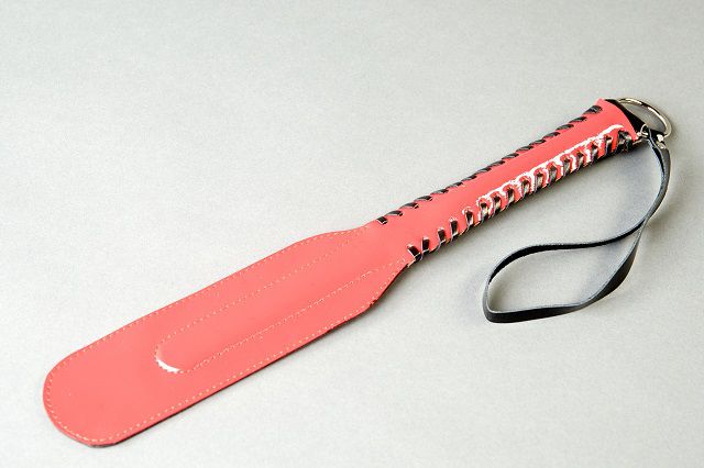 Хлопушка узкая выполнена из лаковой натуральной кожи. Одна сторона ударной части красного цвета, противоположная - черного. Пружинящая вставка из полимерного материала придает спанкеру гибкость. Используется для работы по ягодицам и по верхним мышцам внутренней стороны бедра. Проста в применении и безопасна. Во избежании травм не рекомендуется наносить удары ребром. Ручная работа. Ширина ударной части - 6 см., длина - 18 см.