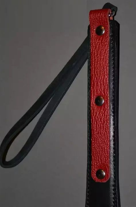 Жесткий спанкер выполнен из матовой натуральной кожи. Ручка украшена красной кожей и фурнитурой. Пружинящая вставка. Проста в применении и безопасна. Во избежании травм не рекомендуется наносить удары ребром. Ручная работа. Ширина - 3 см. Длина ударной части (до ручки) - 35 см