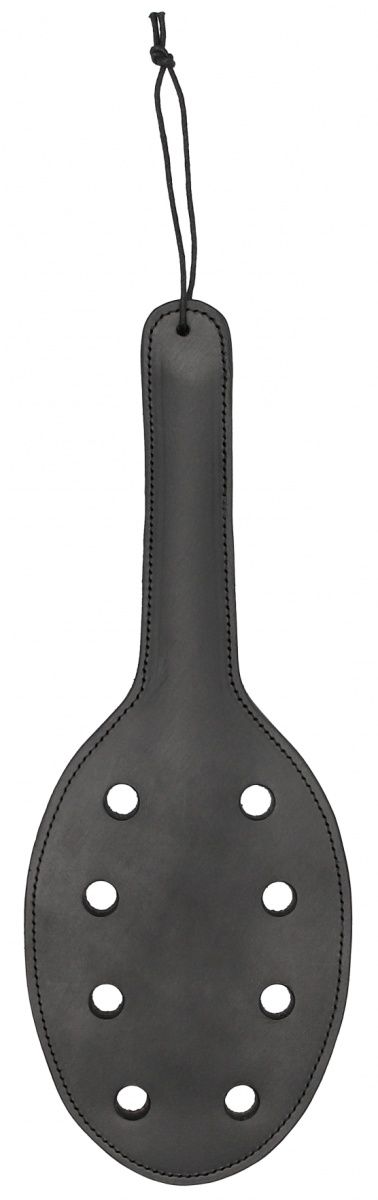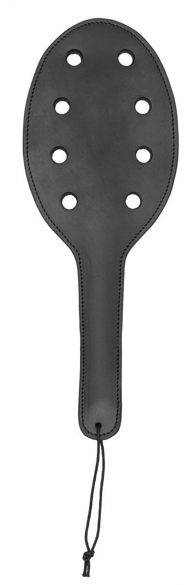 Шлепалка Saddle Leather Paddle With 8 Holes. Эта бита из седельной кожи с 8 отверстиями SADDLE LEATHER PADDLE WITH 8 HOLES предназначена для уменьшения сопротивления и усиления удара. Гибкая, широкая поверхность удара распространит ощущения по всему телу в достаточной степени, чтобы удовлетворить любого страстного поклонника битья! Прочная кожаная петля на запястье обеспечит мощный и уверенный замах и жалящие удары от легкого шлепка до тяжелого удара. Эта бита никогда не подведет вас! Длина рукояти - 14,8 см.