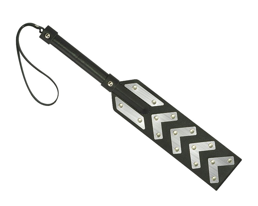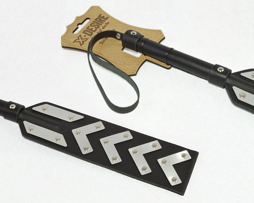 Шлепалка изготовлена из натуральной кожи и вставкок, имитирующих металл. С одной стороны ударная часть хлопушки имеет кожаную поверхность, с другой - декоративную вставку.
