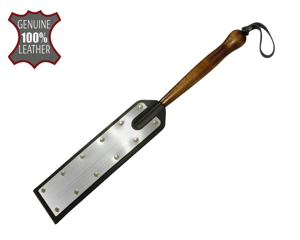 Шлепалка изготовлена из натуральной кожи и декорирована вставкой, имитирующей металл. С одной стороны ударная часть хлопушки имеет кожаную поверхность, с другой декоративную вставку.