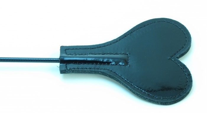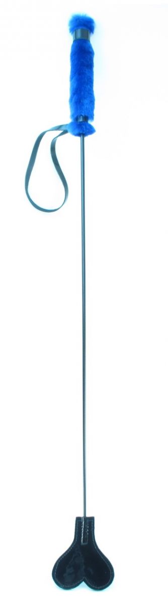 Стек сделан из прочного сердечника с оплеткой из меха. Оформлен БДСМ девайс наконечником в виде сердечка из лаковой кожи для осуществления ударов. Также на ручке присутствует кожаная петля, которая позволяет закрепить стек при проведении наказания партнёра. Девайс отлично подходит для БДСМ игр. Мягкая и гибкая конструкция позволяет избежать повреждений тела даже при сильных ударах. Хлопушка сделана из лаковой кожи, рукоятка стека жёсткая, обшита мехом синего цвета и имеет петлю для фиксации. Ширина хлопушки - 6,5 см.
