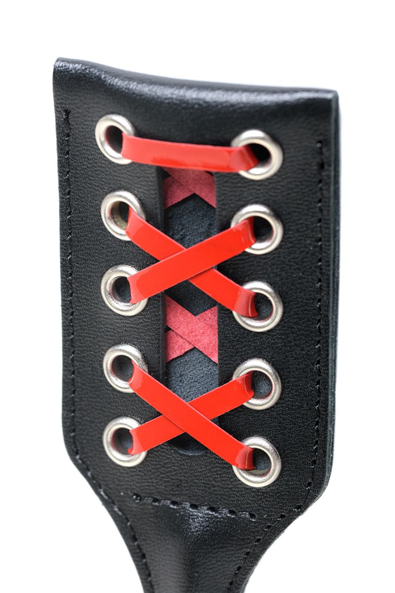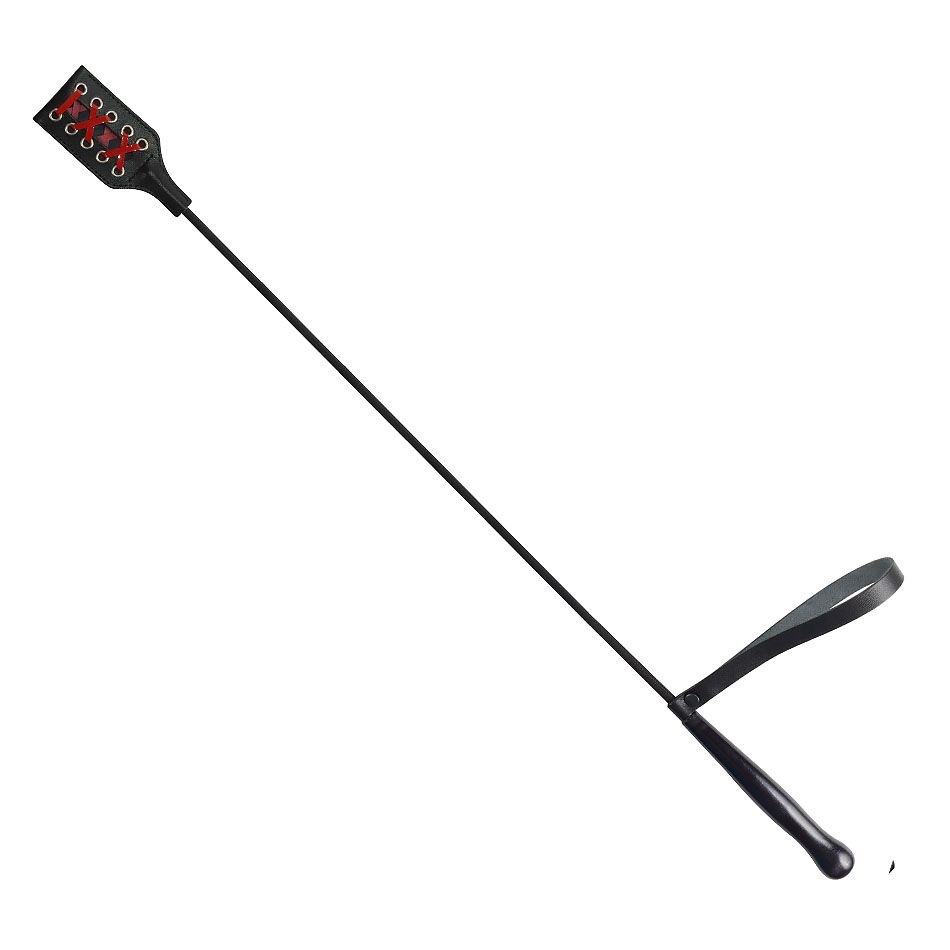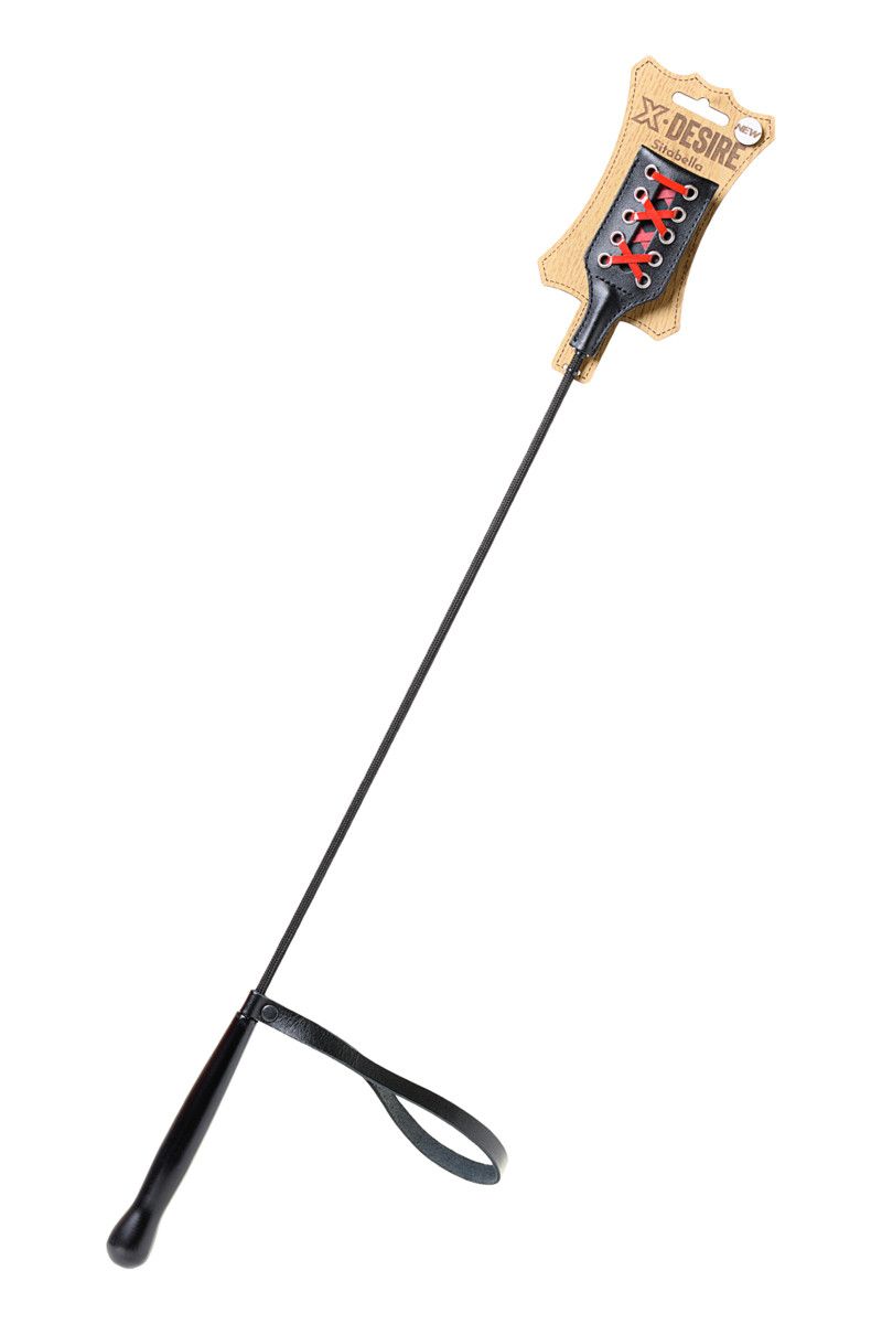 Основа стека - гибкий и прочный углепластик с черным нейлоновым плетёным покрытием. Гладкая и удобная цилиндрическая рукоять изготовлена из дерева и имеет удобную черную кожаную петлю для фиксации изделия на запястье (темляк). Окончание-хлопушка выполнено в виде пластинки из плотной натуральной высококачественной кожи черного цвета, с одной стороны украшенной контрастной шнуровкой из красных лаковых лент.