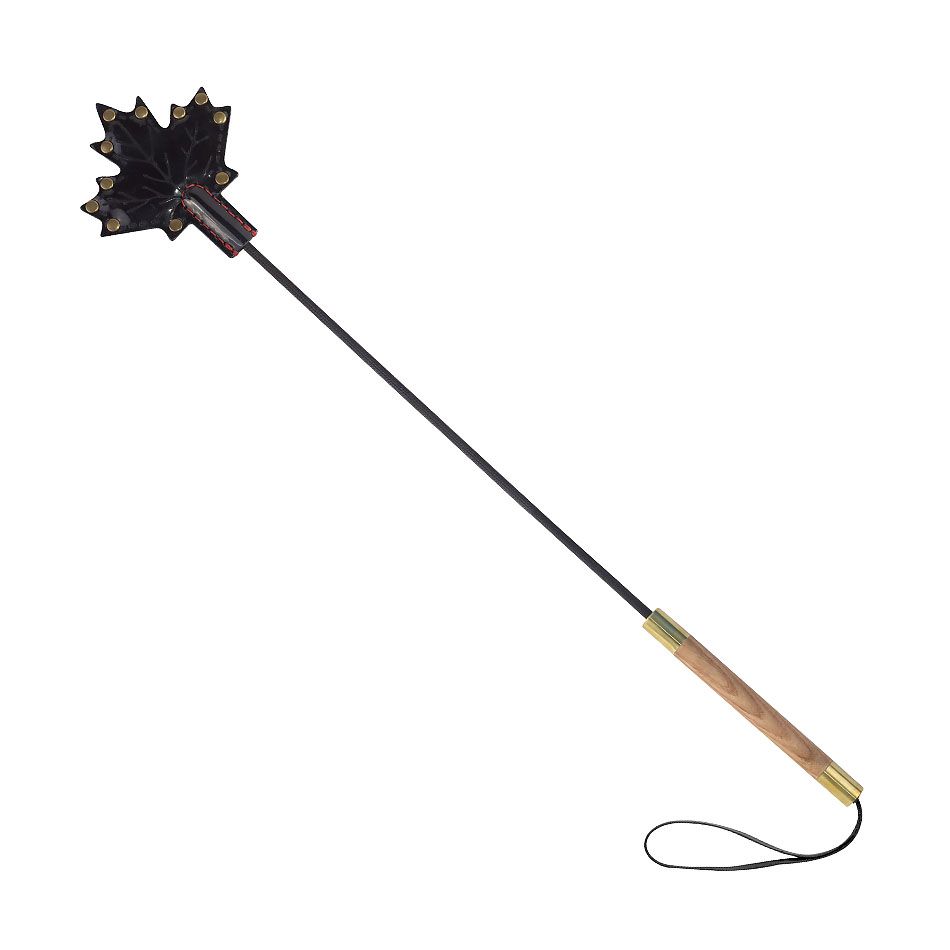 Основа стека гибкий и прочный углепластик с черным нейлоновым плетёным покрытием. Гладкая и удобная цилиндрическая рукоять изготовлена из кавказского ясеня, обладает натуральным светло-коричневым цветом с красивой естественной текстурой. С обеих сторон ручка декорирована элементами из ювелирной латуни. Рукоять имеет удобную черную кожаную петлю для фиксации изделия на запястье (темляк).Окончание-хлопушка выполнено в виде черного с красной прошивкой листка клена с рисунком в виде прожилок. Оно изготовлено из натуральной итальянской лаковой кожи, украшенного бронзового цвета заклепками из ювелирной латуни. Внутри хлопушки находится эластичная вкладка-амортизатор для придания достаточной красности и гибкости.
