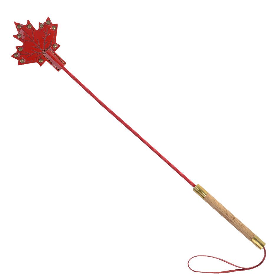 Основа стека гибкий и прочный углепластик с красным нейлоновым плетёным покрытием. Гладкая и удобная цилиндрическая рукоять изготовлена из кавказского ясеня, обладает натуральным светло-коричневым цветом с красивой естественной текстурой. С обеих сторон ручка декорирована элементами из ювелирной латуни. Рукоять имеет удобную красную кожаную петлю для фиксации изделия на запястье (темляк). Окончание-хлопушка выполнено в виде красного с бежевой прошивкой листка клена с рисунком в виде черных прожилок. Оно изготовлено из натуральной итальянской лаковой кожи, украшенного бронзового цвета заклепками из ювелирной латуни. Внутри хлопушки находится эластичная вкладка-амортизатор для придания достаточной красности и гибкости.