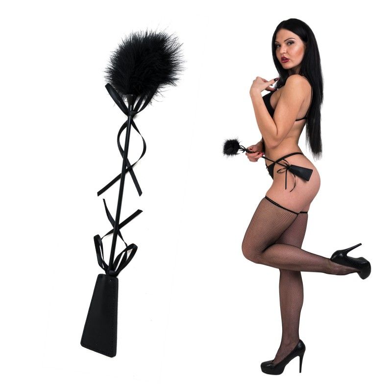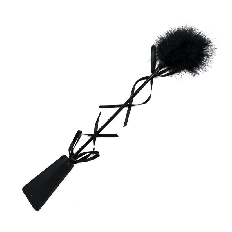 Стек брутального черного цвета с нежной пуховкой для щекотания. Игрушка идеально подходит для страстной любовной прелюдии. Просто проведите этим пушистым аксессуаром по телу вашего партнера, обрисуйте роскошные линии его тела, пощекочите самые сладкие и чувственные места, и он обязательно ответит вам не менее приятными и возбуждающими ласками. Можно также использовать в качестве поощрения после пошлепываний стеком или плеткой.