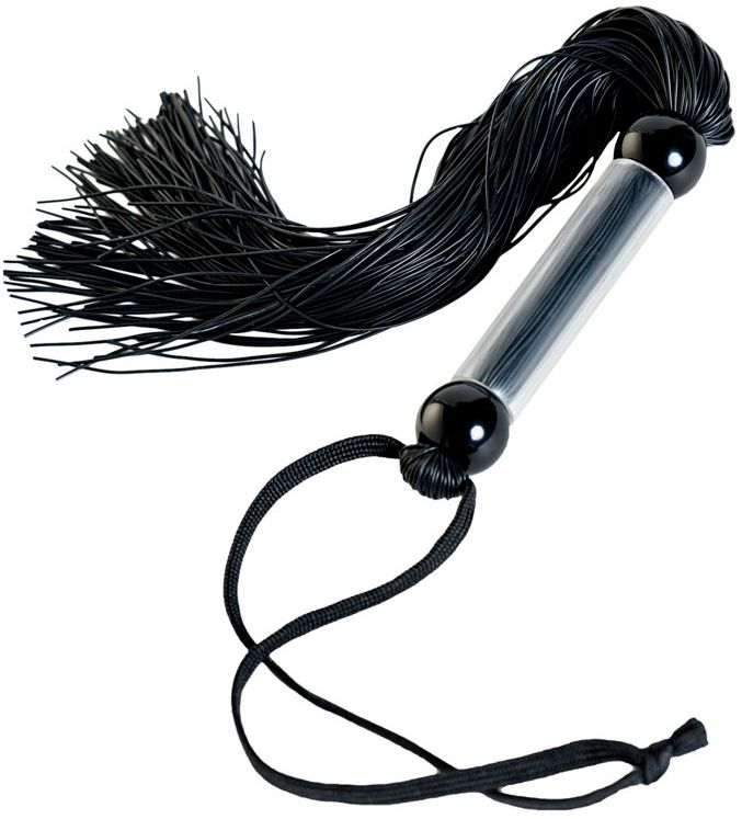 Черный мини - флоггер с резиновыми хвостами. Прекрасный вариант для разогрева и воздействия на наиболее чувствительные зоны. Длина рукояти - 9 см.