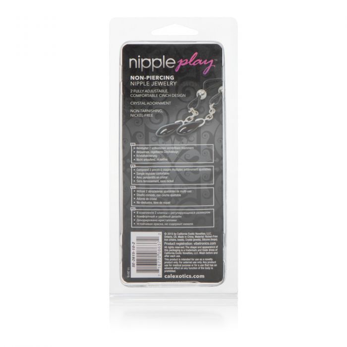 Зажимы на соски Nipple Play Non-Piercing Nipple Jewelry Onyx с украшением в виде подвески с кристаллом служат дополнительным стимулятором одной из самых чувствительных зон. Включают в себя 2 полностью регулируемых многофункциональных зажима в виде петельки. Длина каждого зажима - 5,75 см. Общая длина с камушком - 11,5 см.