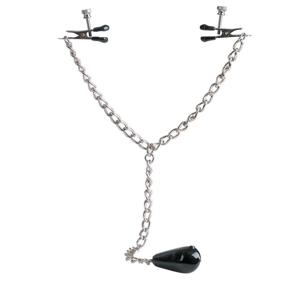 Эта серебристая цепочка украсит собой ваш бюст и подарит сильные, острые ощущения. Она крепится к соскам благодаря зажимам. Сила крепления регулируется с помощью гвоздиков-ограничителей на каждом из них. Чтобы сладостное удовольствие от тисков не покидало вас ни на секунду, к цепочке прикреплен груз в форме капельки, оттягивающий соски вниз. Длина цепочки - 36 см. Длина зажима - 4 см.