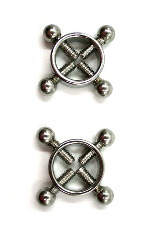Металлические тиски для сосков. 4 вкручивающихся болта по периметру позволяют регулировать силу сжатия. Внутренний диаметр кольца - 2,5 см. Минимальное пространство между болтами (зона сжатия) - 0,5 см.