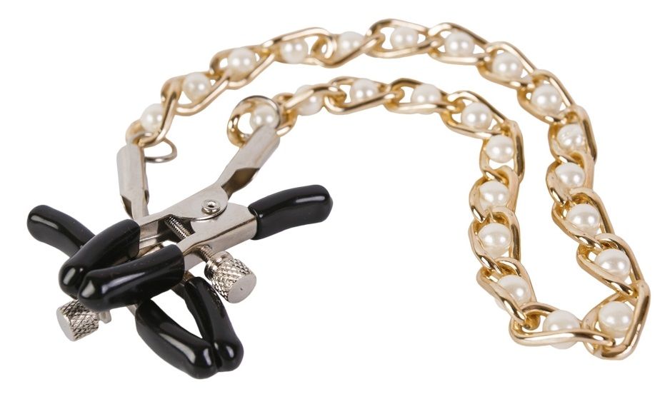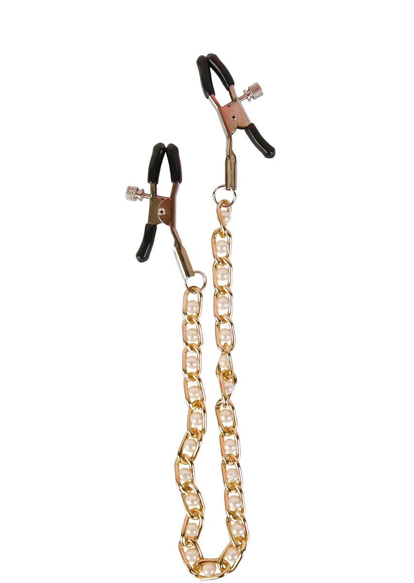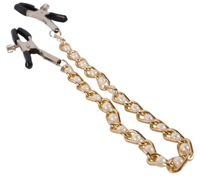 Соски – чувствительная зона, о которых партнер иногда забывает. С зажимами для сосков можно забыть о стимуляции этой чувствительной зоны. Аксессуар все сделает за вас! Стильные зажимы для сосков отделаны латексными резинками, которые сохранят комфорт во время использования. Зажимы соединяются золотистой цепочкой, в звенья которой вставлены белые и золотистые бусинки. При каждом движении вашего тела, цепочка будет двигаться, потягивая соски и привлекая внимание партнера. Сила зажима регулируется винтами. Длина цепочки - 29 см.