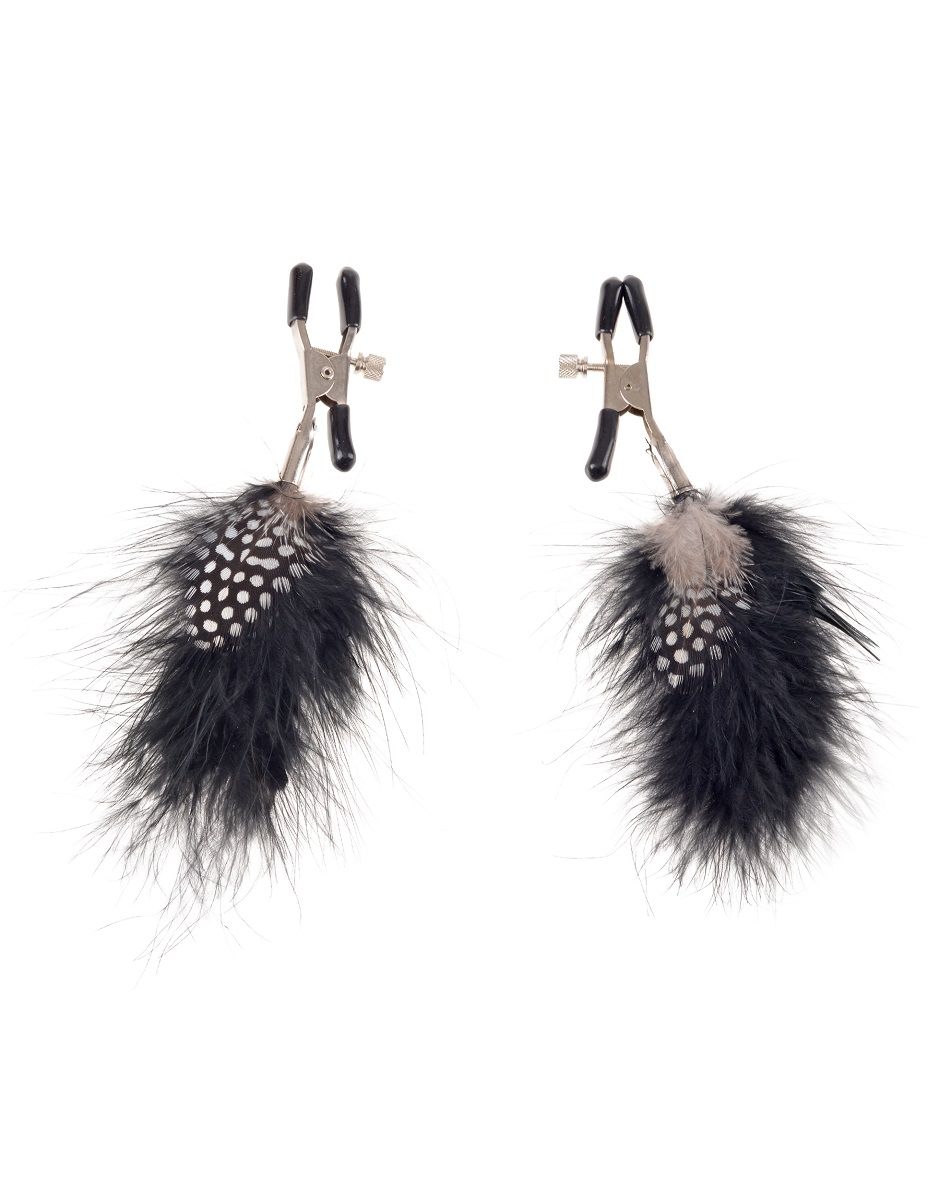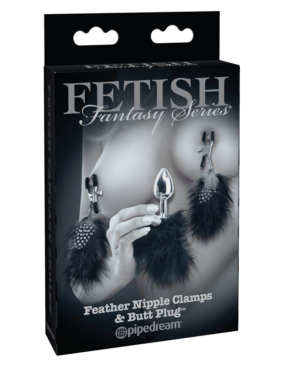 Набор Feather Nipple Clamps Butt Plug: зажимы на соски и анальная пробка с пёрышками. Длина пробки - 12,7 см., рабочая длина - 6,2 см., диаметр - 2,5 см. Длина каждого зажима - 15,2 см.