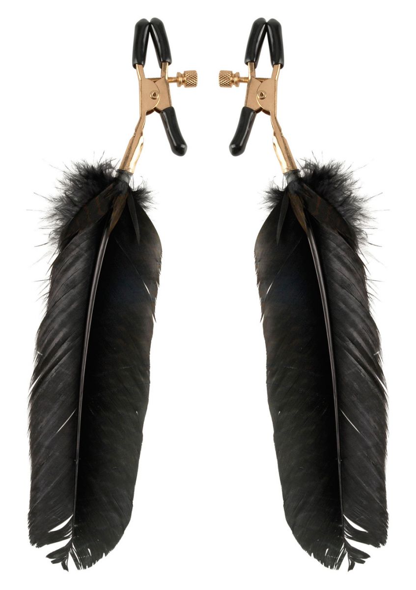 Металлические зажимы для сосков с резиновым покрытием золотого цвета. Сила сжатия регулируется. Украшены черными перышками.