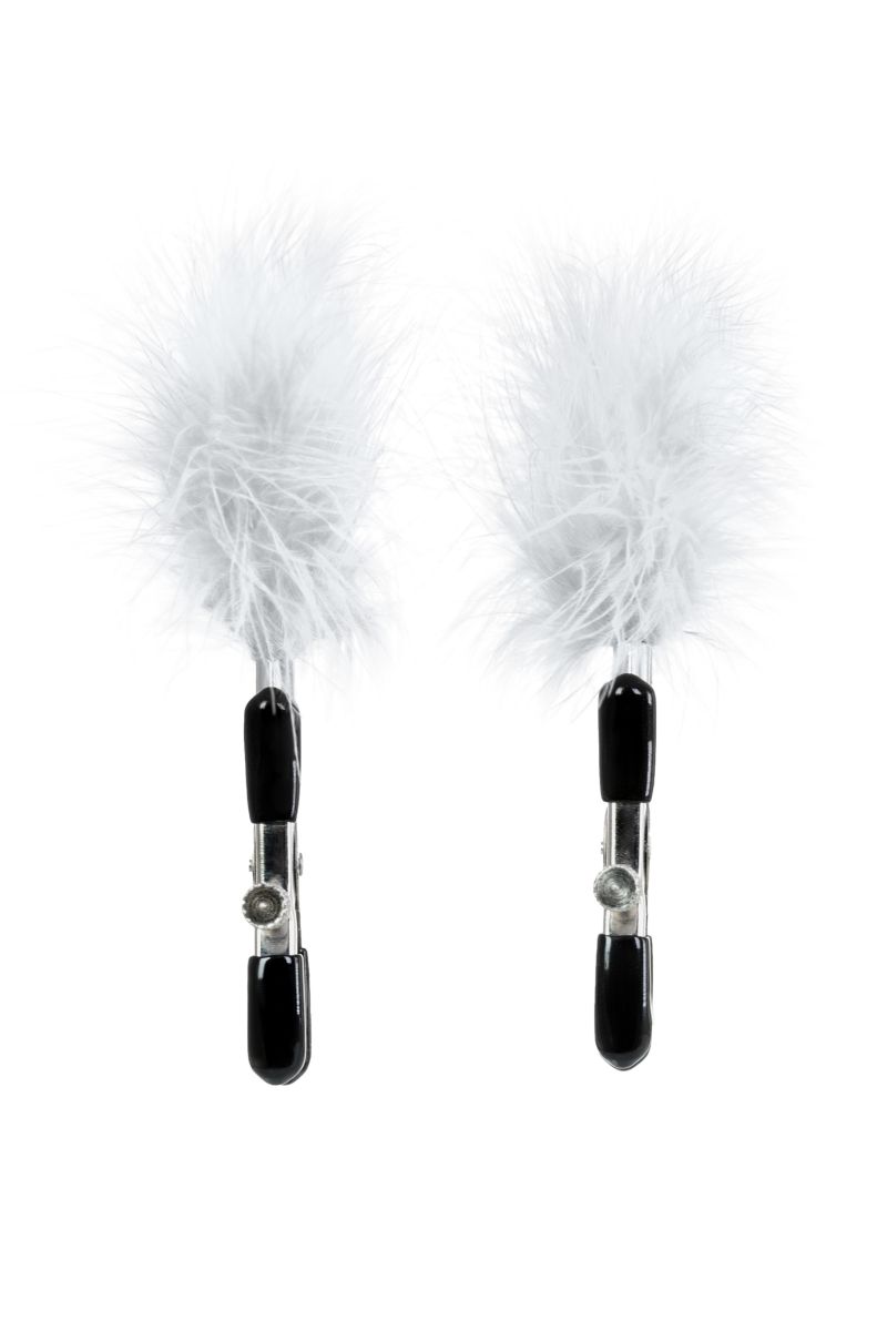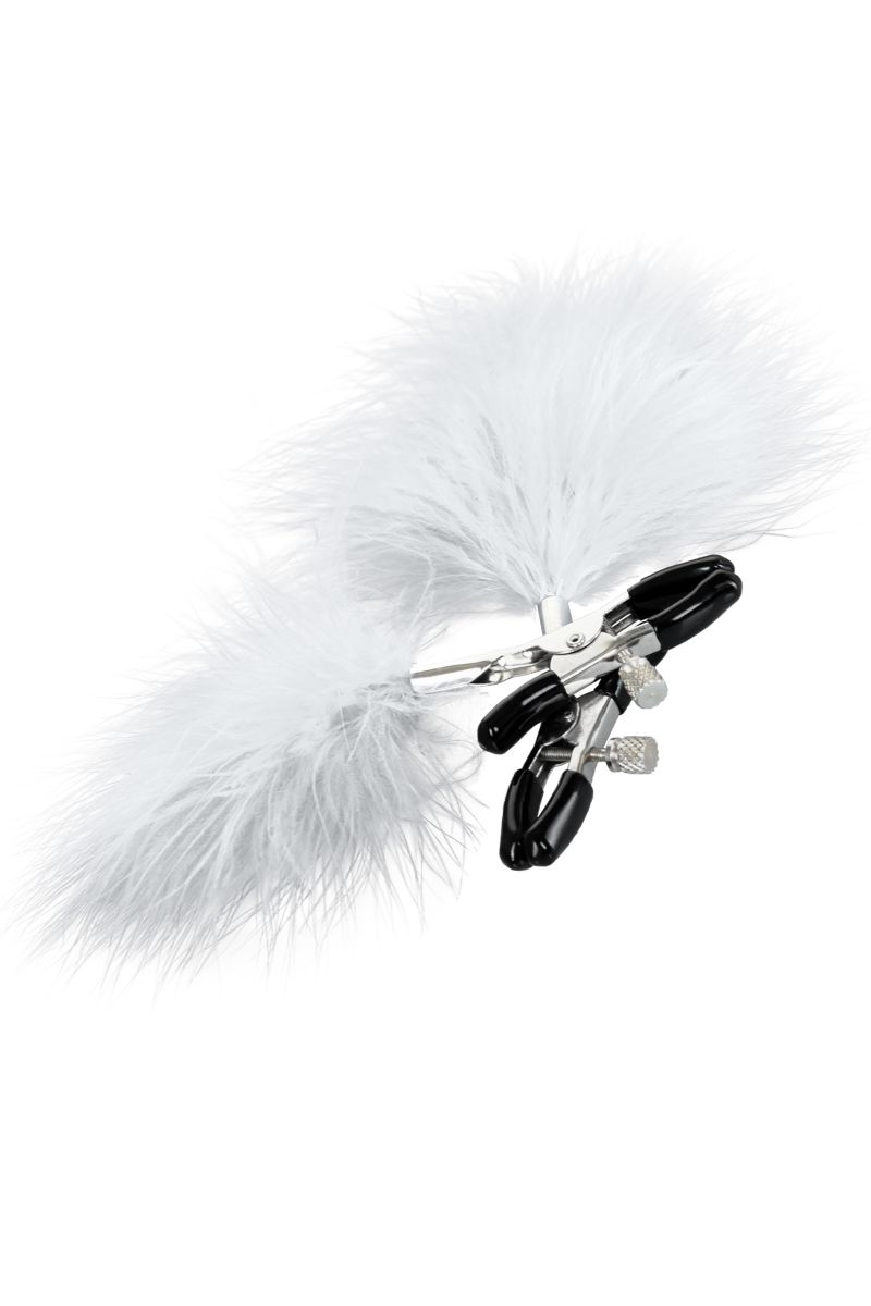 Пожалуй, самые милые из всех зажимов - украшенные перьями. Они стимулируют не только сжатием сосков, но и щекочут грудь. Сдавливание регулируется болтиком и может быть усилено или уменьшено во время интимной игры. Покрытие на концах зажимов защищает нежную кожу.