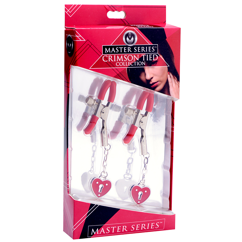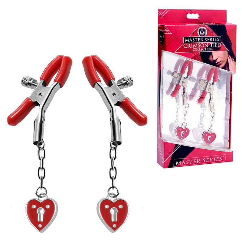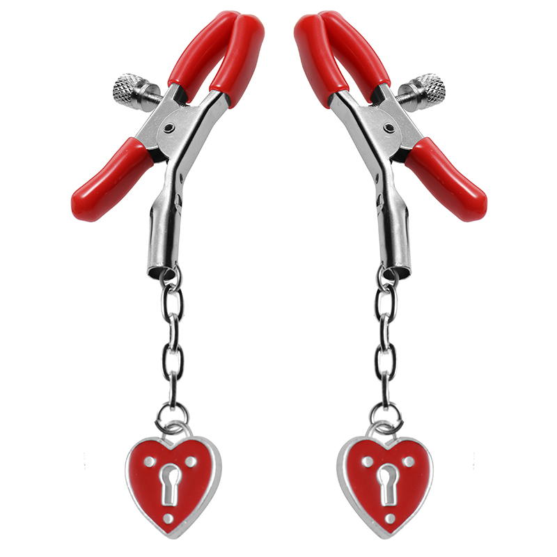 Зажимы для сосков из серебристого металла с мягкими накладочками из винила на кончиках, чтобы не повредить нежную кожу сосков. На тонких цепочках у каждого зажима висит красное сердце с замочной скважиной. Вес каждого зажима около 5 граммов.