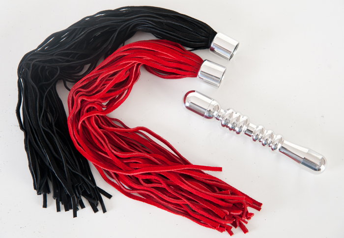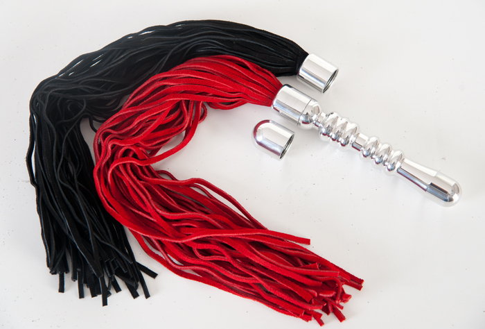Ребристая анальная втулка с двумя сменными плетками - черной и красной. Длина каждой плети - 35 см.