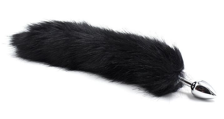 Серебристая металлическая анальная пробка с чёрным хвостом