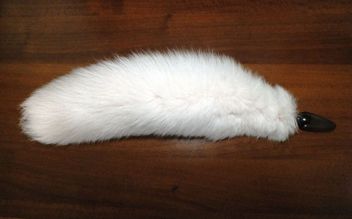 Анальная пробка черного цвета с белым лисьим хвостом. Материал дерево, лак, натуральный мех.