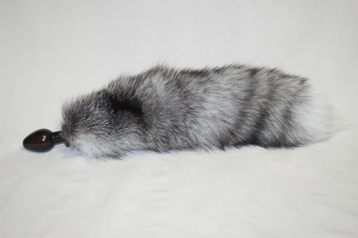 Большая анальная пробка черного цвета с серым лисьим хвостом Диаметр пробки - 4 см. Материалы: дерево, лак, натуральный мех.
