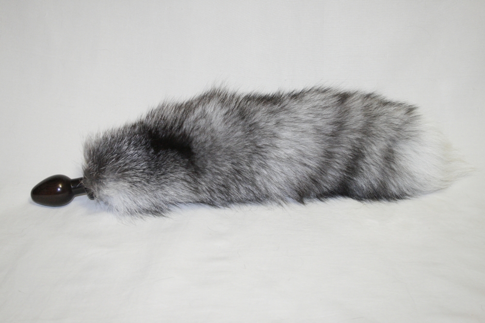 Анальная пробка чёрного цвета с серым лисьим хвостом.
