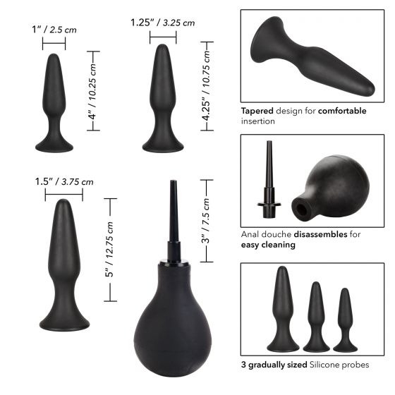 Ultimate Anal Kit - набор, состоящий из трех анальных пробок разного размера и анального душа. Идеален для тренировки сфинктера и стимуляции нервных окончаний анального прохода. Входящий в набор анальный душ предназначен для личной гигиены, а три постепенно увеличивающихся пробки для плавной подготовки к анальному сексу. Изготовлены стимуляторы из гигиеничного, безопасного для тела, не имеющего запаха и не содержащего фталатов силикона. Присоска в основании позволяет надежно закрепить игрушки на любой гладкой поверхности. Длина большой анальной пробки - 12,75 см., диаметр - 3,75 см. Длина средней анальной пробки - 10,75 см., диаметр - 3,25 см. Длина малой анальной пробки - 10,25 см., диаметр - 2,5 см. Длина наконечника - 7,5 см.