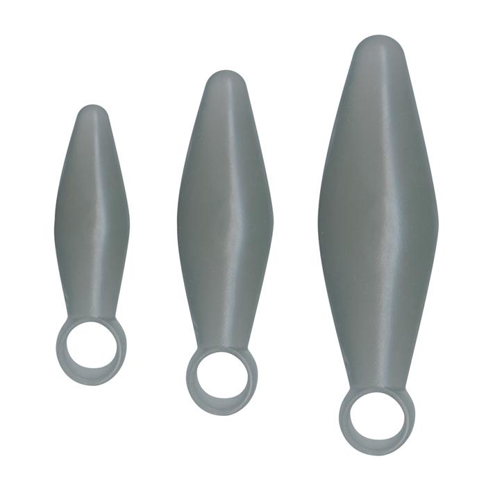 Набор анальных втулок серого цвета. В комплект входят три втулки разные по размеру. Каждая в основании имеет колечко, позволяющее надевать игрушку на палец, что делает ее использование безопасным. Длина большой втулки - 8 см., диаметр - 2,5 см. Длина средней втулки - 6,5 см., диаметр - 2 см. Длина малой втулки - 5 см., диаметр - 1,5 см.