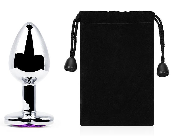 Серебристая анальная пробка с фиолетовым кристаллом-сердечком