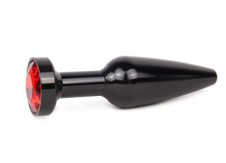 Удлиненная коническая гладкая чёрная анальная втулка с красным кристаллом