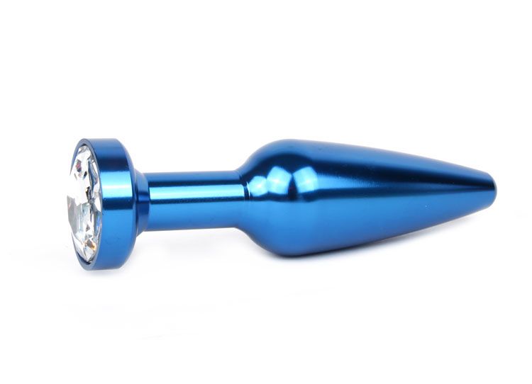 Удлиненная коническая гладкая синяя анальная втулка с прозрачным кристаллом