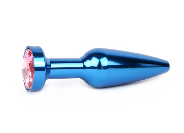 Удлиненная коническая гладкая синяя анальная втулка с розовым кристаллом