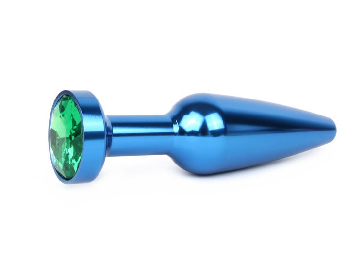 Удлиненная коническая гладкая синяя анальная втулка с зелёным кристаллом