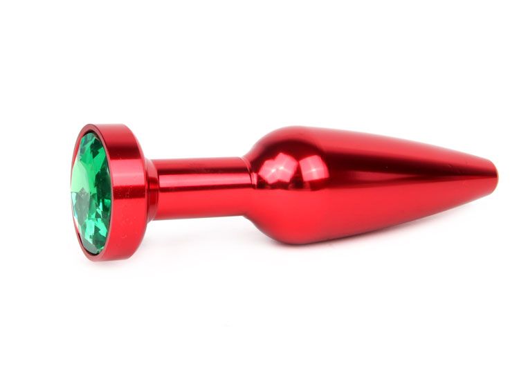 Удлиненная коническая гладкая красная анальная втулка с зелёным кристаллом