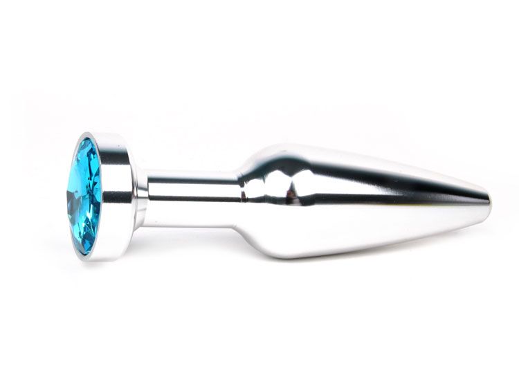 Удлиненная коническая гладкая серебристая анальная втулка с голубым кристаллом
