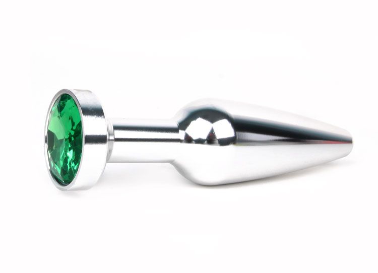 Удлиненная коническая гладкая серебристая анальная втулка с зелёным кристаллом