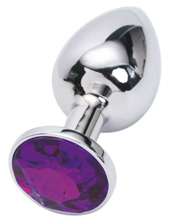 Серебристая анальная пробка из металла с фиолетовым стразом