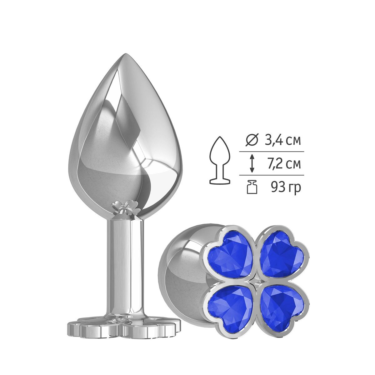 Средняя серебристая анальная втулка с клевером из синих кристаллов Сумерки богов 529-07 blue-DD (8,5 см)