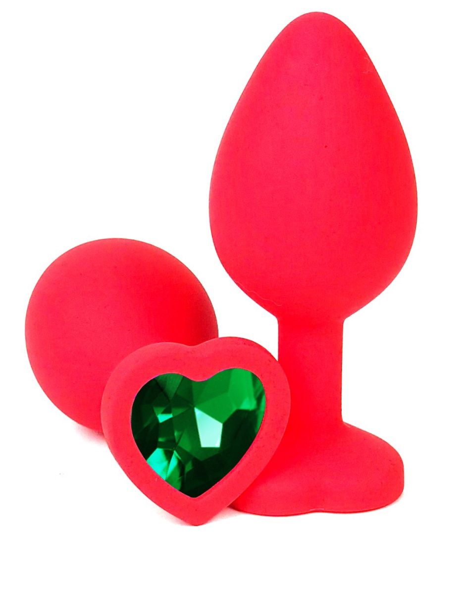 Красная силиконовая анальная пробка с зелёным стразом-сердцем