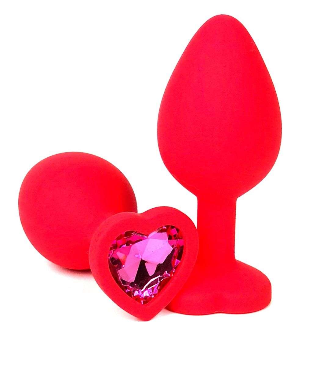 Красная силиконовая анальная пробка с розовым стразом-сердцем
