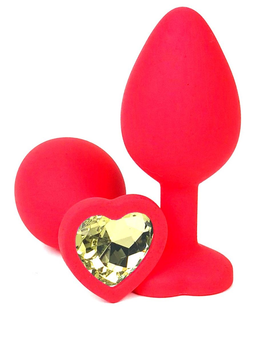 Красная силиконовая анальная пробка с жёлтым стразом-сердцем